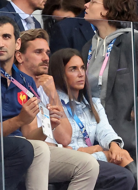 Info - Antoine Griezmann annonce sa retraite internationale - Antoine Griezmann et sa femme Erika Choperena - Les célébrités assistent à la Finale de Rugby à 7 opposant la France aux Fidji lors des Jeux Olympiques de Paris 2024 (JO) au Stade de France à Saint-Denis, Seine Saint-Denis, le 27 juillet 2024. © Jacovides-Perusseau/Bestimage Celebs in the stands during the Men's Rugby Sevens Gold Medal match between France and Fiji on day one of the Olympic Games Paris 2024 at Stade de France on July 27, 2024 in Paris, France.