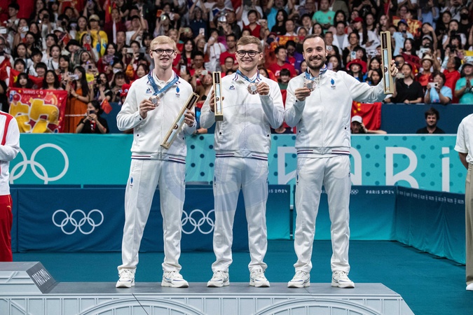 Info - Le pongiste Félix Lebrun atteint la 4ème place du classement mondial - Felix Lebrun, Alexis Lebrun and Simon Cauzy (FRA), Team men's table tennis, against Sweden Team, podium, during the Olympic Games Paris 2024 © Baptiste Autissier / Panoramic / Bestimage