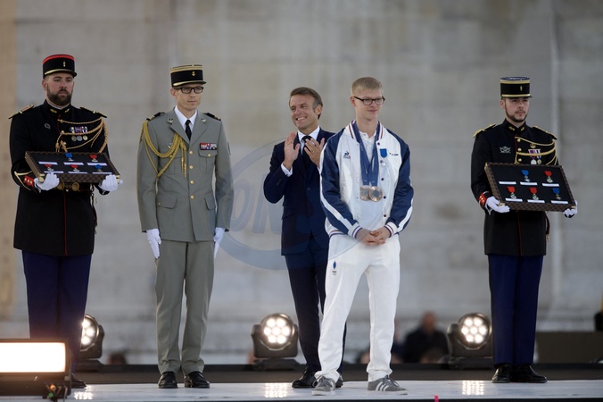 Info - Le pongiste Félix Lebrun atteint la 4ème place du classement mondial - La "Parade des Champions" des Jeux Olympiques et Paralympiques de Paris2024, sur les Champs-Elysées. Paris, le 14 septembre 2024. © Nicolas Messyasz/Pool/Bestimage French president Emmanuel Macron, french athlete Felix Lebrun during an award ceremony at the foot of the Arc de Triomphe at the end of the parade of French athletes who competed in the Paris 2024 Olympic and Paralympic Games in Paris on September 14, 2024.