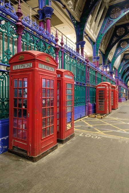 Phone boxes in Grand Avenue, West Smithfield meat market in the City of London.Considerably quieter than it used to be. It is believed the market may move to east London. The Museum of London is moving into part of the market in the future.London. United Kingdom. 22 February 2024, Credit:Mark Fairhurst / Avalon