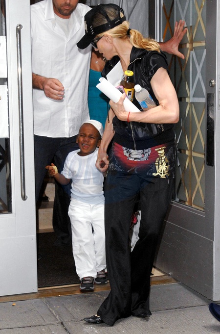 Madonna z adoptowanym synem Davidem wychodza z centrum Kabaly, Nowy Jork