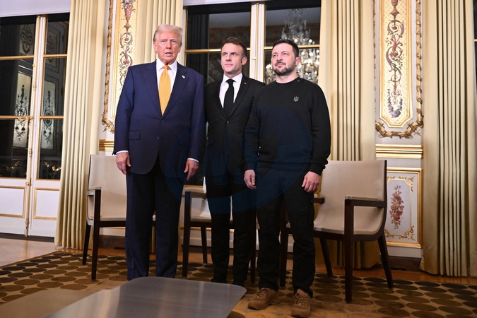 Prezydent Francji Emmanuel Macron przyjmuje swoich amerykańskich odpowiedników Donalda Trumpa i Ukraińca Wołodymyra Zełenskiego w Pałacu Prezydenckim Elizejskim w Paryżu