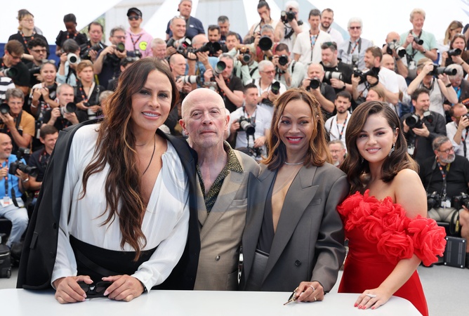 Info - "Emilia Perez", de Jacques Audiard, en tête des nominations pour les Golden Globes - Karla Sofía Gascón, Jacques Audiard, Zoe Saldana et Selena Gomez - Photocall du film "Emilia Perez" lors du 77ème Festival International du Film de Cannes le 19 mai 2024. © Jacovides / Moreau / Bestimage Photocall for the film "Emilia Perez" at the 77th Cannes International Film Festival on 19 May 2024