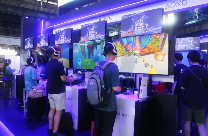 Visitors try out the game Astro Bot, the Nintendo-style platformer from Sony's Team Asobi during ChinaJoy digital entertainment show in Shanghai, China Friday, July 26, 2024. , Astro Bot was awarded The Game Award for Game of the Year 2024 on Dec. 12., Credit:YUYU CHEN / Avalon