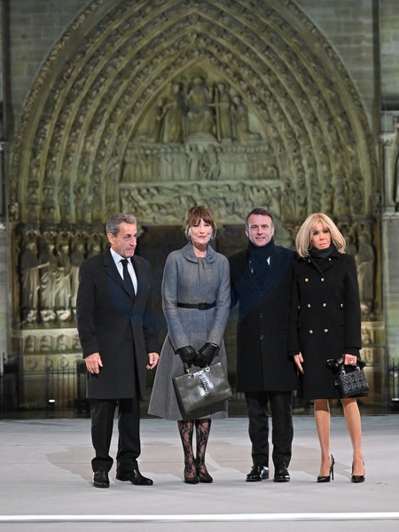 Info - Nicolas Sarkozy définitivement condamné à un an ferme sous bracelet électronique dans l'affaire des écoutes. L'ancien président annonce saisir la Cour européenne des droits de l'Homme - Théma - Carla Bruni recycle un manteau porté à Londres en 2008 - French President, Emmanuel Macron and his wife, Brigitte Macron, Former French President, Nicolas Sarkozy and his wife Carla Bruni attend the welcome ceremony at official reopening ceremony of Notre-Dame Cathedral in Paris, France on December 7, 2024, after more than five-years of reconstruction work following the April 2019 fire. © Eliot Blondet/Pool/Bestimage