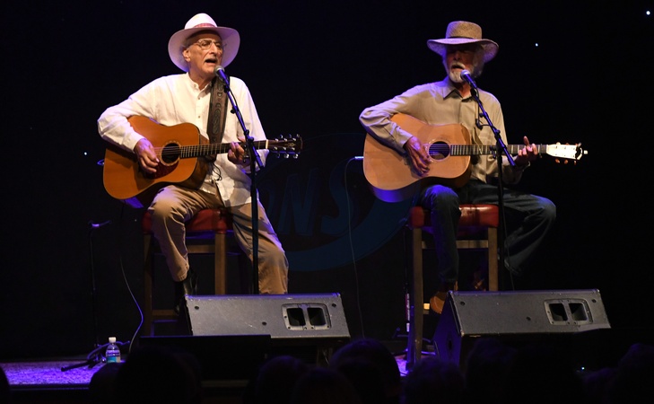 Musicians Mike Brewer and Tom Shipley are shown performing on stage during a live concert appearance with Brewer & Shipley.