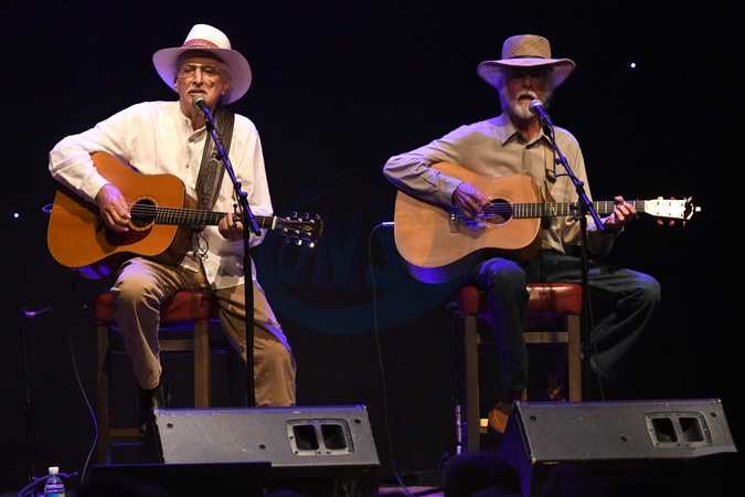 Musicians Mike Brewer and Tom Shipley are shown performing on stage during a live concert appearance with Brewer & Shipley., Credit:John Atashian / Avalon