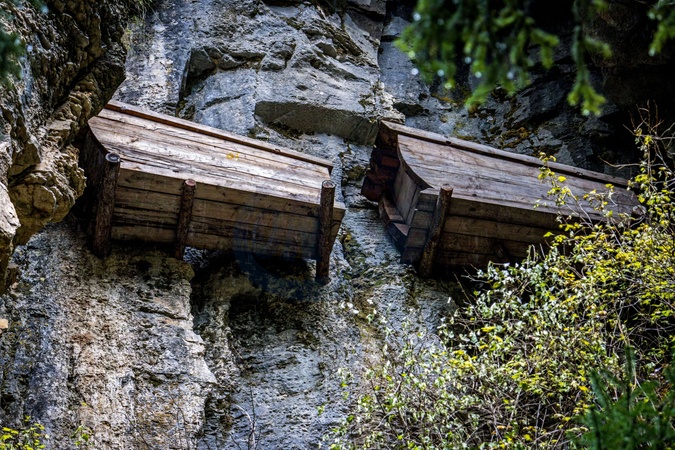 A view of two wooden coffins resting on cantilevers inserted into the cliff on Luya Mountain in Ningwu county in north China's Shanxi province Sunday, Oct. 06, 2024. Over a hundred cliff burials, mostly from Ming and Qing Dynasties, have been found in recent years in the area, a rare case of cliff burials in northern China., Credit:WANG ZIRUI / Avalon