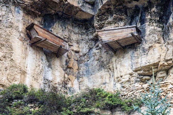 A view of two wooden coffins resting on cantilevers inserted into the cliff on Luya Mountain in Ningwu county in north China's Shanxi province Sunday, Oct. 06, 2024. Over a hundred cliff burials, mostly from Ming and Qing Dynasties, have been found in recent years in the area, a rare case of cliff burials in northern China., Credit:WANG ZIRUI / Avalon