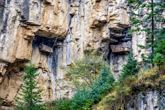 A view of two wooden coffins resting on cantilevers inserted into the cliff on Luya Mountain in Ningwu county in north China's Shanxi province Sunday, Oct. 06, 2024. Over a hundred cliff burials, mostly from Ming and Qing Dynasties, have been found in recent years in the area, a rare case of cliff burials in northern China., Credit:WANG ZIRUI / Avalon