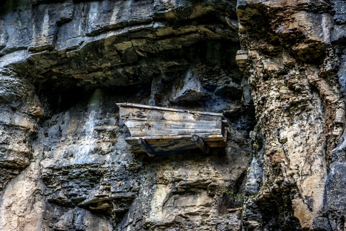 A wooden coffin resting on cantilevers inserted into the cliff on Luya Mountain in Ningwu county in north China's Shanxi province Sunday, Oct. 06, 2024. Over a hundred cliff burials, mostly from Ming and Qing Dynasties, have been found in recent years in the area, a rare case of cliff burials in northern China., Credit:WANG ZIRUI / Avalon