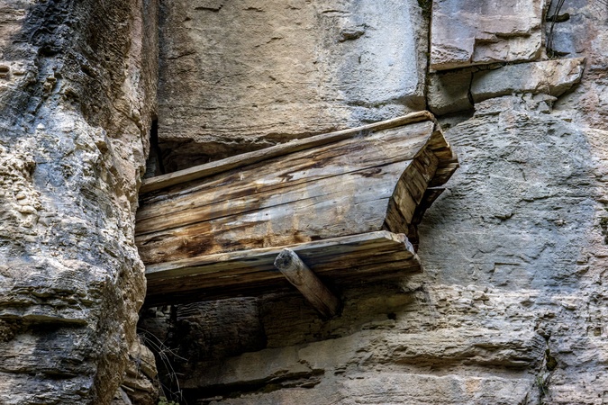 A wooden coffin resting on cantilevers inserted into the cliff on Luya Mountain in Ningwu county in north China's Shanxi province Sunday, Oct. 06, 2024. Over a hundred cliff burials, mostly from Ming and Qing Dynasties, have been found in recent years in the area, a rare case of cliff burials in northern China., Credit:WANG ZIRUI / Avalon