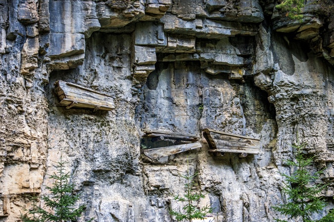 A view of two wooden coffins resting on cantilevers inserted into the cliff on Luya Mountain in Ningwu county in north China's Shanxi province Sunday, Oct. 06, 2024. Over a hundred cliff burials, mostly from Ming and Qing Dynasties, have been found in recent years in the area, a rare case of cliff burials in northern China., Credit:WANG ZIRUI / Avalon