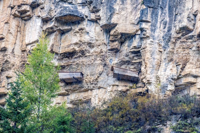 A view of two wooden coffins resting on cantilevers inserted into the cliff on Luya Mountain in Ningwu county in north China's Shanxi province Sunday, Oct. 06, 2024. Over a hundred cliff burials, mostly from Ming and Qing Dynasties, have been found in recent years in the area, a rare case of cliff burials in northern China., Credit:WANG ZIRUI / Avalon