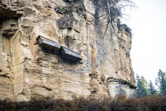 A view of two wooden coffins resting on cantilevers inserted into the cliff on Luya Mountain in Ningwu county in north China's Shanxi province Sunday, Oct. 06, 2024. Over a hundred cliff burials, mostly from Ming and Qing Dynasties, have been found in recent years in the area, a rare case of cliff burials in northern China., Credit:WANG ZIRUI / Avalon