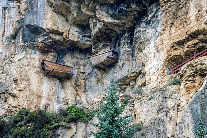 A view of two wooden coffins resting on cantilevers inserted into the cliff on Luya Mountain in Ningwu county in north China's Shanxi province Sunday, Oct. 06, 2024. Over a hundred cliff burials, mostly from Ming and Qing Dynasties, have been found in recent years in the area, a rare case of cliff burials in northern China., Credit:WANG ZIRUI / Avalon