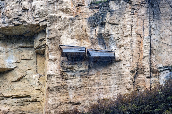 A view of two wooden coffins resting on cantilevers inserted into the cliff on Luya Mountain in Ningwu county in north China's Shanxi province Sunday, Oct. 06, 2024. Over a hundred cliff burials, mostly from Ming and Qing Dynasties, have been found in recent years in the area, a rare case of cliff burials in northern China., Credit:WANG ZIRUI / Avalon