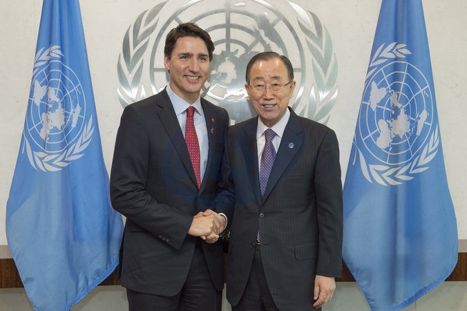 Justin Trudeau a rencontré le secrétaire général Ban Ki-moon aux Nations Unies à New York. Le 15 mars 2016 Secretary-General Ban Ki-moon (right) meets with H.E. Mr. Justin Trudeau, Prime Minister of Canada.