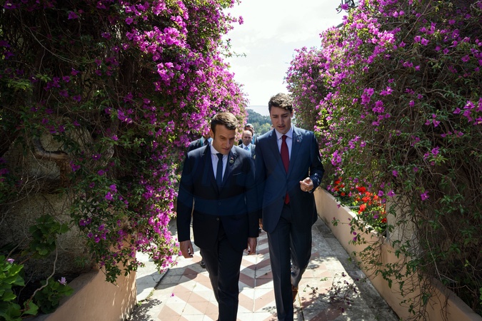 Emmanuel Macron rencontre Justin Trudeau (le premier ministre du Canada) lors du sommet du G7 à Taormina, le 26 mai 2017. Prime Minister Trudeau meets with Emmanuel Macron, President of the French Republic, during the G7 in Taormina. May 26, 2017.