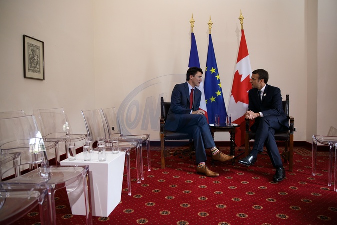 Emmanuel Macron rencontre Justin Trudeau (le premier ministre du Canada) lors du sommet du G7 à Taormina, le 26 mai 2017. Prime Minister Trudeau meets with Emmanuel Macron, President of the French Republic, during the G7 in Taormina. May 26, 2017.