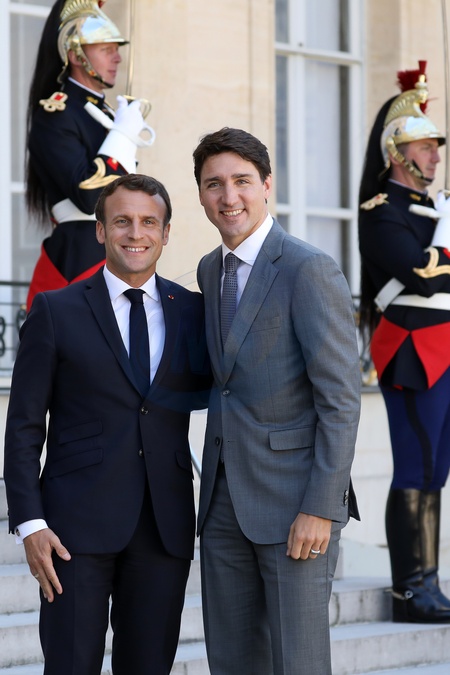 Le président de la république, Emmanuel Macron reçoit le premier ministre du Canada, Justin Trudeau pour un entretien au palais de l'Elysée, Paris, France, le 15 mai 2019.© Stéphane Lemouton / Bestimage Emmanuel Macron, french resident receives international leaders at the Tech for Good Summit - Call from Christchurch to take action against terrorism and violent extremism online, at the Elysee Palace, Paris, May 15th, 2019.