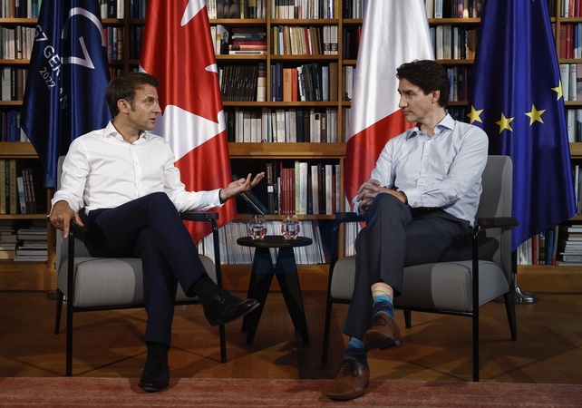Le président de la République française, Emmanuel Macron rencontre le Premier ministre canadien, Justin Trudeau lors du sommet du G7 à l'hôtel "Schloss Elmau" à Krün, en Allemagne, le 27 juin 2022. © Benoit Tessier/Pool/Bestimage Canadian Prime Minister Justin Trudeau meets with French President Emmanuel Macron during the G7 leaders summit at Bavaria's Schloss Elmau castle, near Garmisch-Partenkirchen, Germany June 27, 2022.