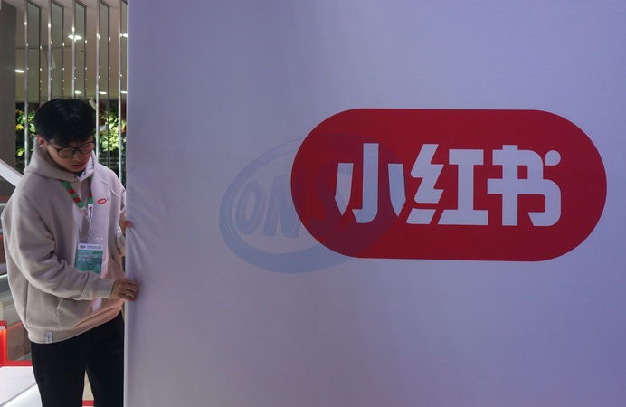 A worker adjusts a poster at the booth of RedNote during a trade show of digital and consumer electronics in Shanghai, China Thursday, March 14, 2024. Many TikTok users in the United States started using RedNote, another China-based social mobile app., Credit:LONG WEI / Avalon