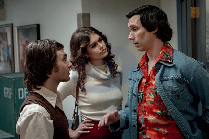 Lorne Michaels (Gabriel LaBelle), Jacqueline Carlin (Kaia Gerber), Chevy Chase (Cory Michael Smith) in "Saturday Night" (2024)., Credit:Hopper Stone / Avalon