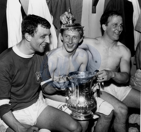 25th May 1963: The 'cap' fits Manchester Utd's Denis Law - it comes from the FA Cup that he helped to win at Wembley Stadium. Man Utd beat Leicester City 3-1 and Law scored the first goal. David Herd scored the other two.Photo shows: (left - right) David Herd, Denis Law and Maurice Setters., Credit:TALKING SPORT/Photoshot / Avalon
