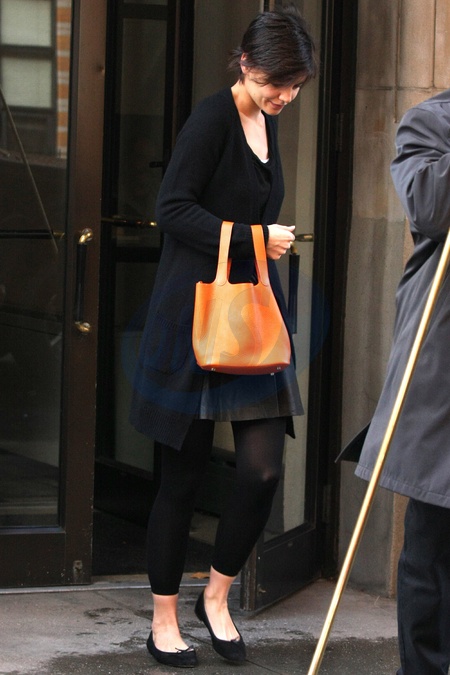 Katie Holmes wychodzi z teatru Schoenfeld w Nowym Jorku