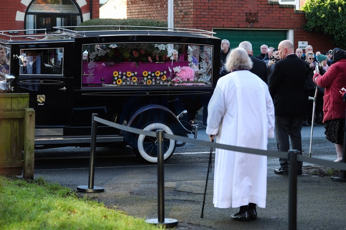 The car carrying Linda Nolans coffin arrives during the The Funeral of Linda Nolan at St. Paul's Church, Blackpool, United Kingdom, 1st February 2025, Credit:Gareth Evans/News Images / Avalon