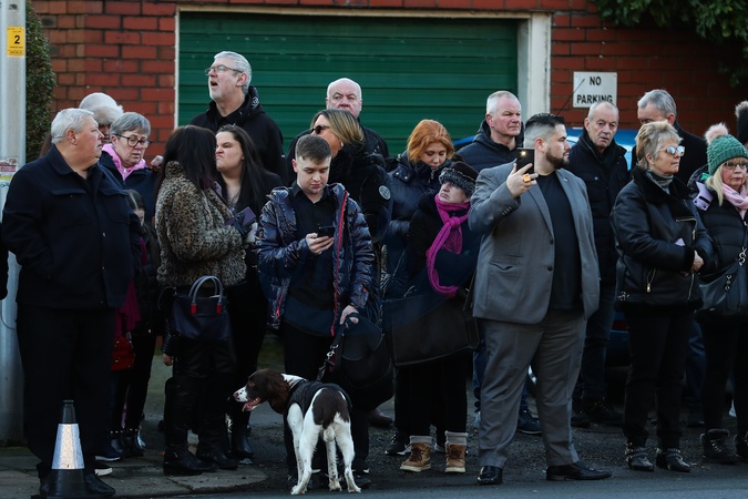 Bystanders watch on as people arrive for the Funeral of Linda Nolan at St. Paul's Church, Blackpool, United Kingdom, 1st February 2025, Credit:Gareth Evans/News Images / Avalon