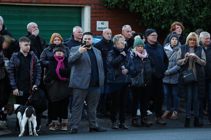 Bystanders watch on as people arrive for the Funeral of Linda Nolan at St. Paul's Church, Blackpool, United Kingdom, 1st February 2025, Credit:Gareth Evans/News Images / Avalon