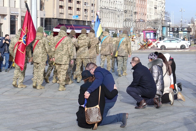 KYIV, UKRAINE - JANUARY 30, 2025 - People kneel as soldiers carry the coffin of Polish citizen Filip Antosiak, 19, a serviceman of the 25th Sicheslavska Separate Airborne Brigade of Ukraine's Armed Forces who died in the Porkovsk direction in Donetsk region on January 19, during a memorial ceremony in Maidan Nezalezhnosti, Kyiv, capital of Ukraine. (Photo by Pavlo Bahmut/Ukrinform), Credit:Pavlo Bahmut / Avalon