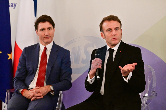 Justin Trudeau, premier ministre du Canada, le président Emmanuel Macron lors de la conclusion de la réunion sur le partenariat mondial pour l'intelligence artificielle au Quai d'Orsay à Paris le 9 février 2025 © Christian Liewig / Bestimage Conclusion of the meeting on the global partnership for artificial intelligence at the Quai d'Orsay in Paris on 9 February 2025