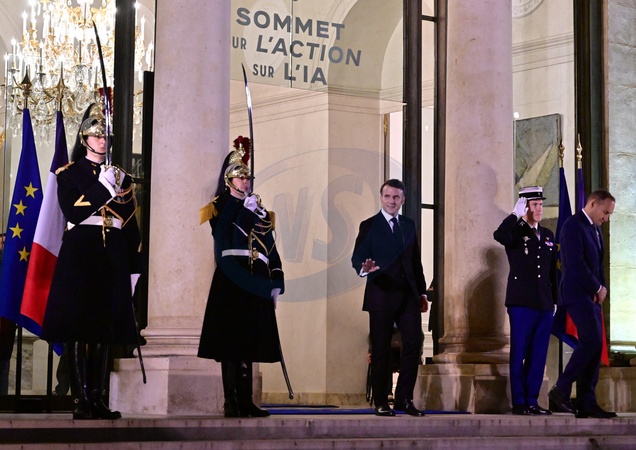 Le président Emmanuel Macron accueille Justin Trudeau, premier ministre du Canada, pour un dîner de travail au palais de l'Elysée dans le cadre du sommet pour l'action sur l'IA le 9 février 2025 © Christian Liewig / Bestimage President Emmanuel Macron welcomes Justin Trudeau, Prime Minister of Canada, for a working dinner at the Elysée Palace as part of the summit for action on AI on 9 February 2025