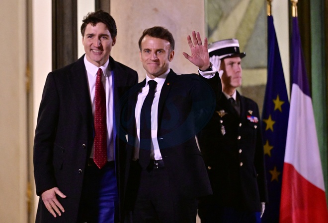 Le président Emmanuel Macron accueille Justin Trudeau, premier ministre du Canada, pour un dîner de travail au palais de l'Elysée dans le cadre du sommet pour l'action sur l'IA le 9 février 2025 © Christian Liewig / Bestimage President Emmanuel Macron welcomes Justin Trudeau, Prime Minister of Canada, for a working dinner at the Elysée Palace as part of the summit for action on AI on 9 February 2025