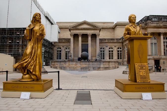 Statue de Gisèle Halimi et Simone Veil - Illustration des statues de dix femmes célèbres, installées près du pont Alexandre-III lors de la cérémonie d'ouverture des Jeux Olympiques de Paris 2024. Le 16 janvier 2025 © Céline Bonnarde / Bestimage Illustration of the statues of ten famous women, installed near the Alexandre-III bridge during the opening ceremony of the Paris 2024 Olympic Games. On January 16, 2025