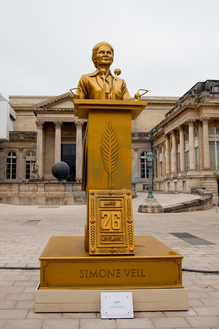 Statue de Simone Veil - Illustration des statues de dix femmes célèbres, installées près du pont Alexandre-III lors de la cérémonie d'ouverture des Jeux Olympiques de Paris 2024. Le 16 janvier 2025 © Céline Bonnarde / Bestimage Illustration of the statues of ten famous women, installed near the Alexandre-III bridge during the opening ceremony of the Paris 2024 Olympic Games. On January 16, 2025