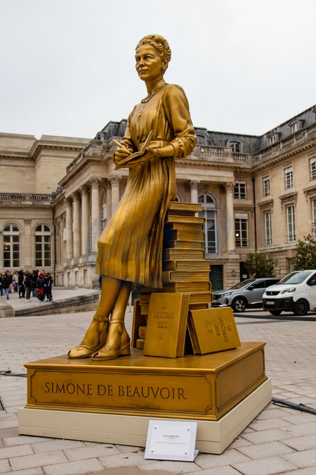 Statue de Simone de Beauvoir - Illustration des statues de dix femmes célèbres, installées près du pont Alexandre-III lors de la cérémonie d'ouverture des Jeux Olympiques de Paris 2024. Le 16 janvier 2025 © Céline Bonnarde / Bestimage Illustration of the statues of ten famous women, installed near the Alexandre-III bridge during the opening ceremony of the Paris 2024 Olympic Games. On January 16, 2025