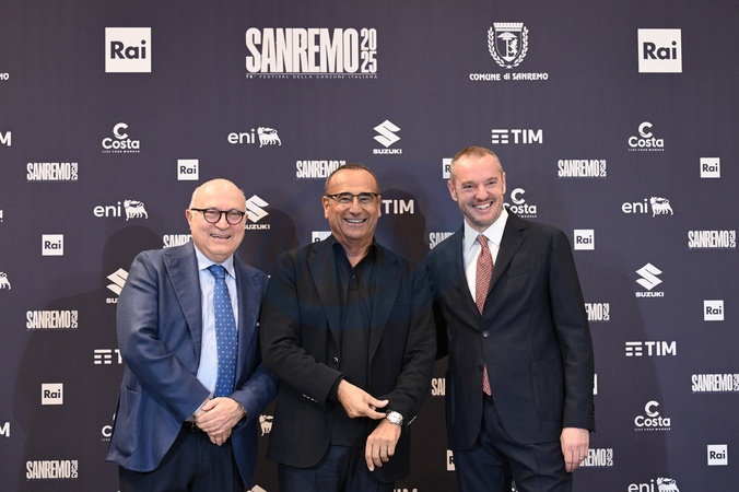 Maurizio Fattaccio President Rai Advertising, Carlo Conti, Luca Poggi CEO Rai Advertising during advertising photocall during 75th Sanremo Festival, Sanremo, Italy 10 Feb 2025, Credit:Maria Laura Antonelli / Avalon