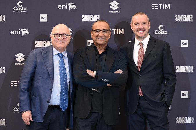 Maurizio Fattaccio President Rai Advertising, Carlo Conti, Luca Poggi CEO Rai Advertising during advertising photocall during 75th Sanremo Festival, Sanremo, Italy 10 Feb 2025, Credit:Maria Laura Antonelli / Avalon