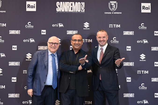 Maurizio Fattaccio President Rai Advertising, Carlo Conti, Luca Poggi CEO Rai Advertising during advertising photocall during 75th Sanremo Festival, Sanremo, Italy 10 Feb 2025, Credit:Maria Laura Antonelli / Avalon