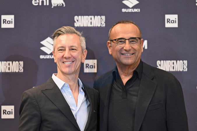 Paolo De Ponti CEO and Head of Strategy, Veralab & Overskin, Carlo Conti during advertising photocall during 75th Sanremo Festival, Sanremo, Italy 10 Feb 2025, Credit:Maria Laura Antonelli / Avalon