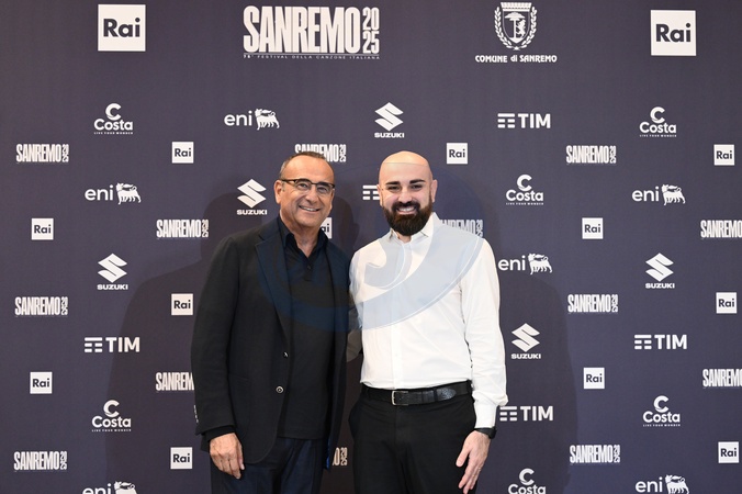 Carlo Conti, Diego Daniele Director, Media & Connections Italy and Albania Coca Cola during advertising photocall during 75th Sanremo Festival, Sanremo, Italy 10 Feb 2025, Credit:Maria Laura Antonelli / Avalon
