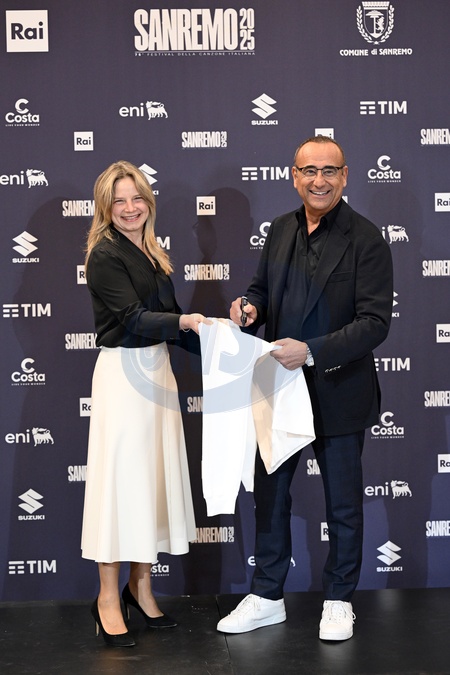 Arianna Nardi Marketing Generali Italia, Carlo Conti during advertising photocall during 75th Sanremo Festival, Sanremo, Italy 10 Feb 2025, Credit:Maria Laura Antonelli / Avalon