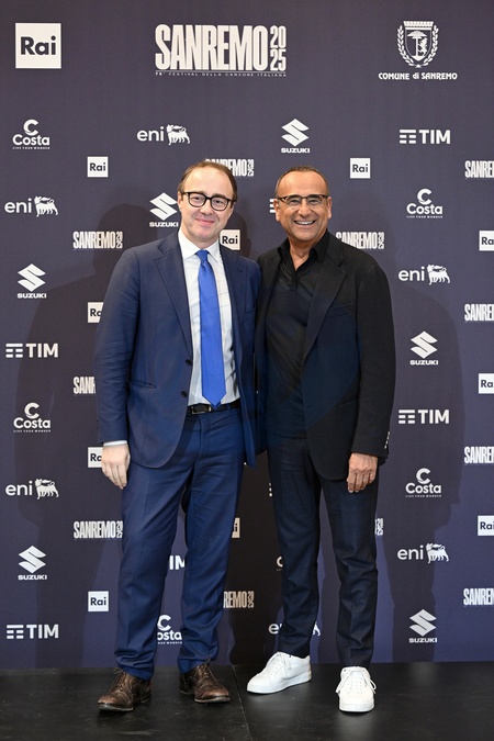 Marco Martelli Communication Director Elah Dufour Novi , Carlo Conti during advertising photocall during 75th Sanremo Festival, Sanremo, Italy 10 Feb 2025, Credit:Maria Laura Antonelli / Avalon