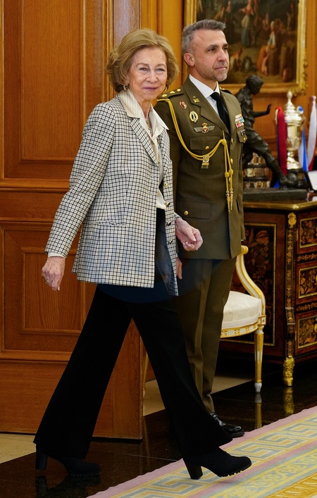La reine Sofia assiste à une audience avec les membres de l'association Heroes de 4 Patas (Héros à 4 pattes) au Palais de la Zarzuela à Madrid, Espagne, le 10 février 2025. © Lalo Yasky/Bestimage Emerit Queen Sofia attends an audience with members of the association Heroes de 4 Patas (4 Legs Héroes) at Zarzuela Palace, in Madrid, Spain, on February 10, 2025.