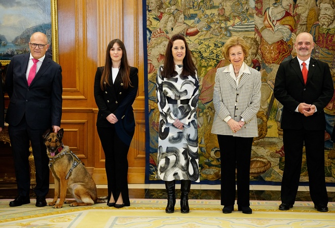 Królowa Sofia uczestniczy w audiencji z członkami stowarzyszenia Heroes de 4 Patas (Czternożni Bohaterowie) w Pałacu Zarzuela w Madrycie.