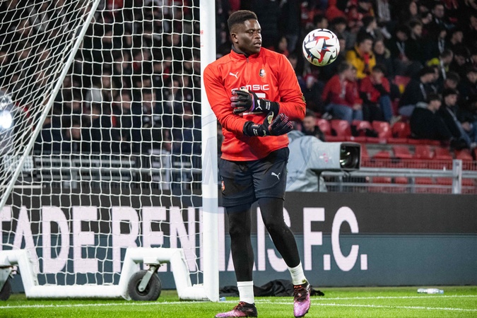 Brice Samba (Stade Rennais) - Match de Ligue 1 McDonald's "Rennes - Lille (0-2)" au Roazhon Park, le 16 février 2025. Huit mois après son malaise cardio-respiratoire, le milieu de terrain Nabil Bentaleb, autorisé à jouer avec un défibrilateur, une première en Ligue 1, a ouvert le score pour son grand retour avec son équipe du LOSC. Ligue 1 McDonald's match "Rennes - Lille (0-2)" at Roazhon Park, February 16, 2025. Eight months after his cardio-respiratory malaise, midfielder Nabil Bentaleb, authorized to play with a defibrillator, a first in Ligue 1, opened the scoring for his big comeback with his LOSC team.